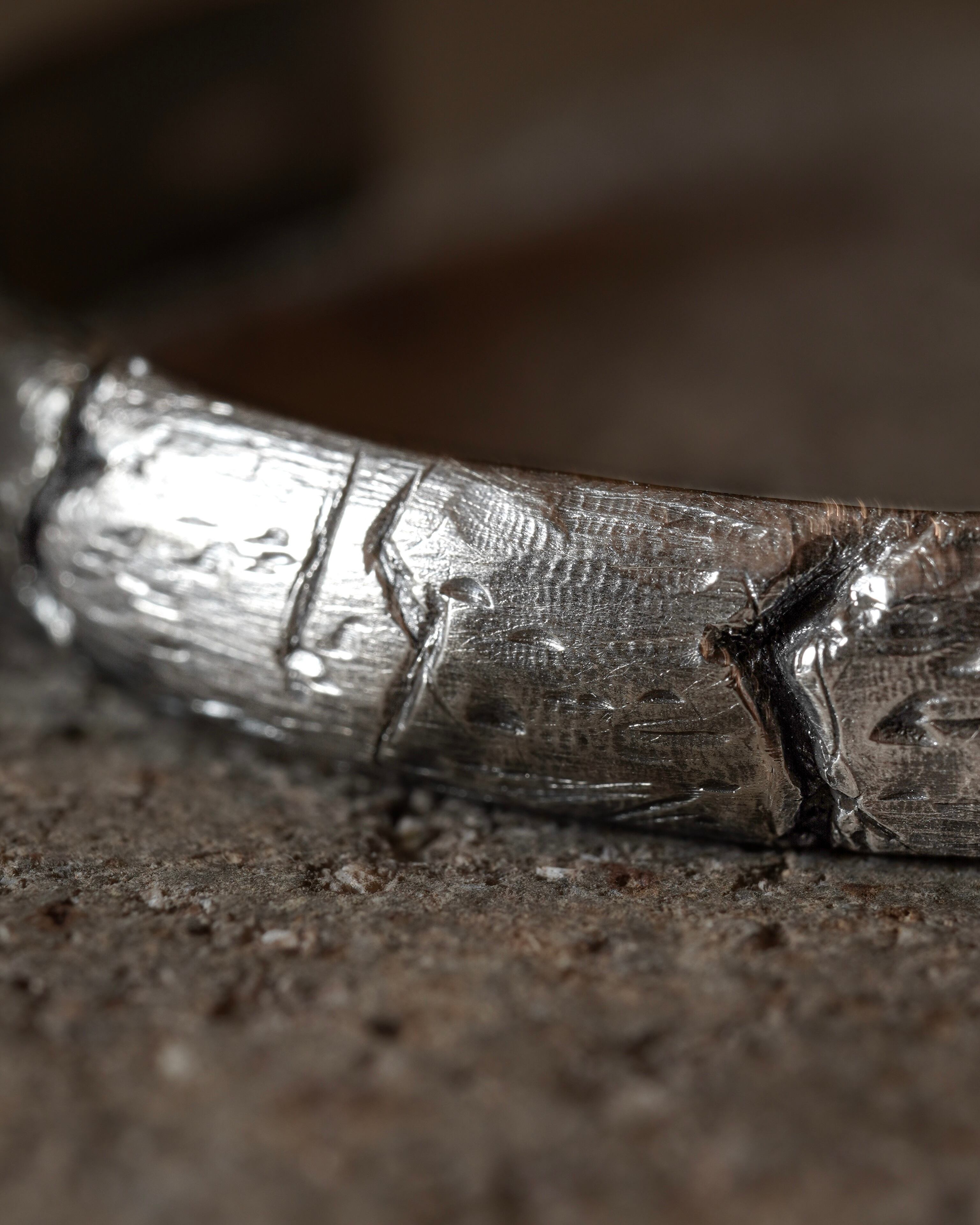 叩き跡や燻しの濃淡は一点ごとに異なり、着用を重ねるほどに銀特有の経年変化が現れ、唯一無二の表情へと育っていきます。