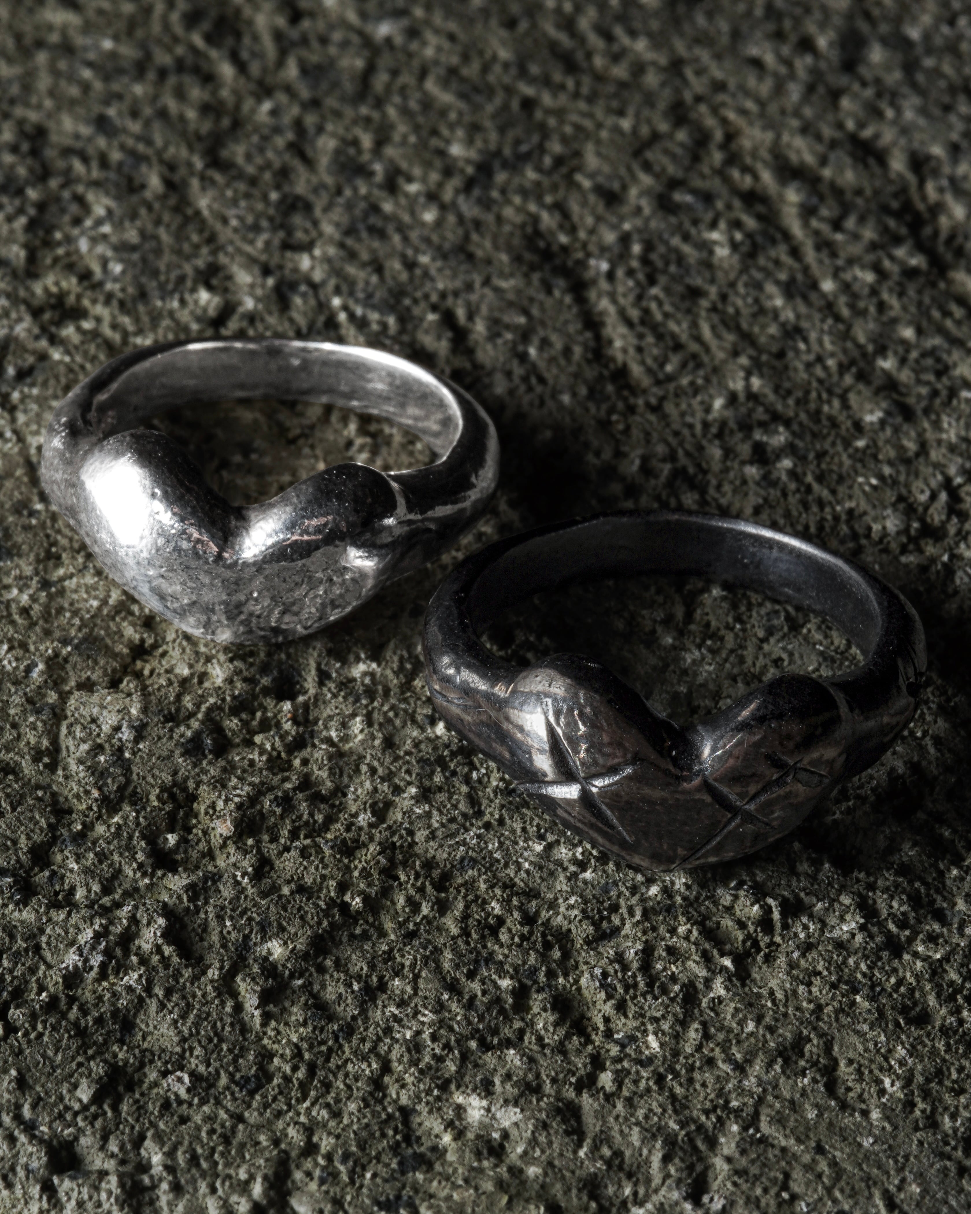 ・Finish:写真右の「燻/傷加工あり」をご希望の場合は、備考欄にご記入ください。燻しを入れることで、銀の奥に潜む深みと重厚さを引き出します。