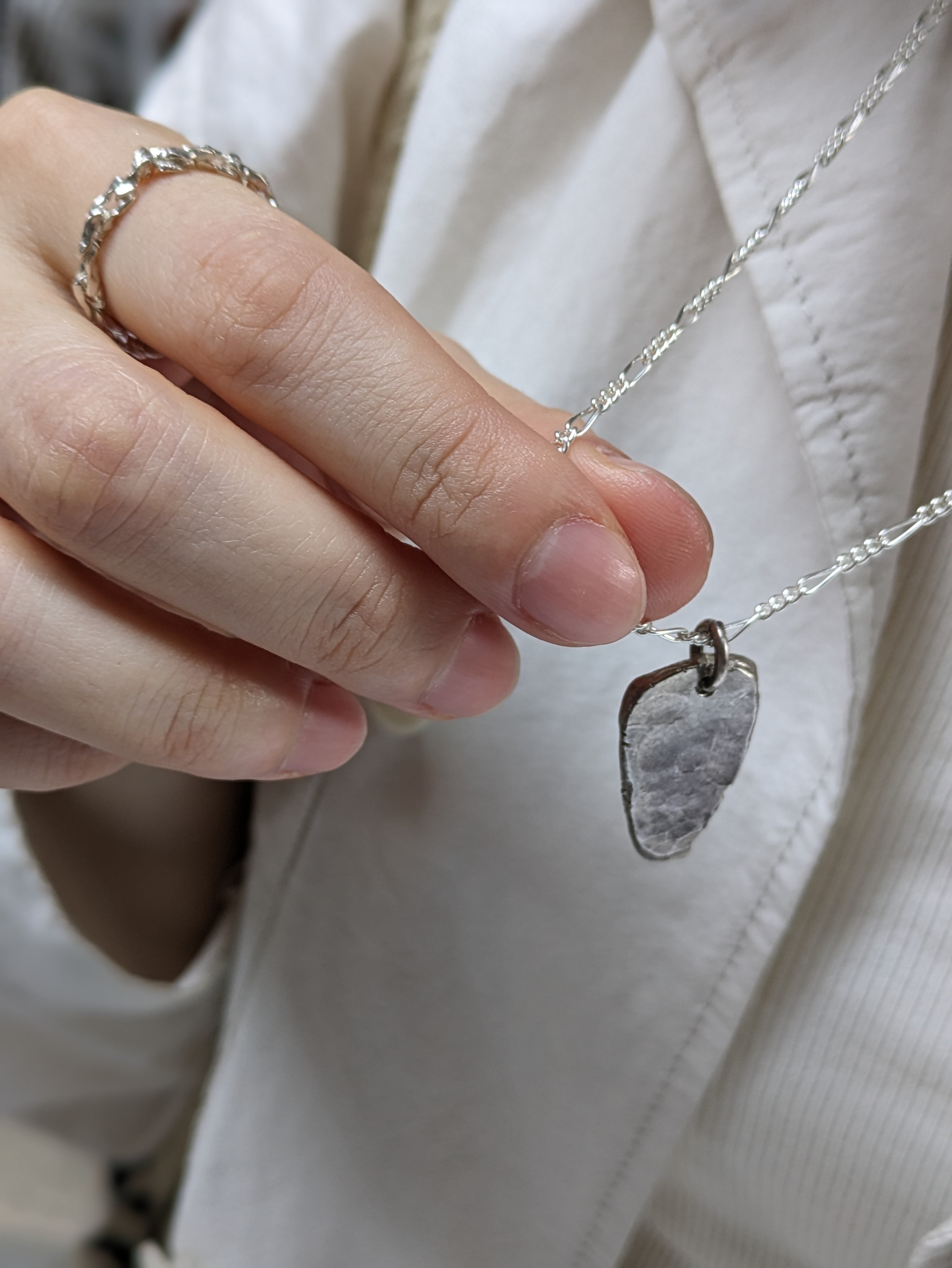 銀の表面に刻まれた傷や燻しは、時とともに表情を変え、身につける人の首元で独自の存在感を放ちます。