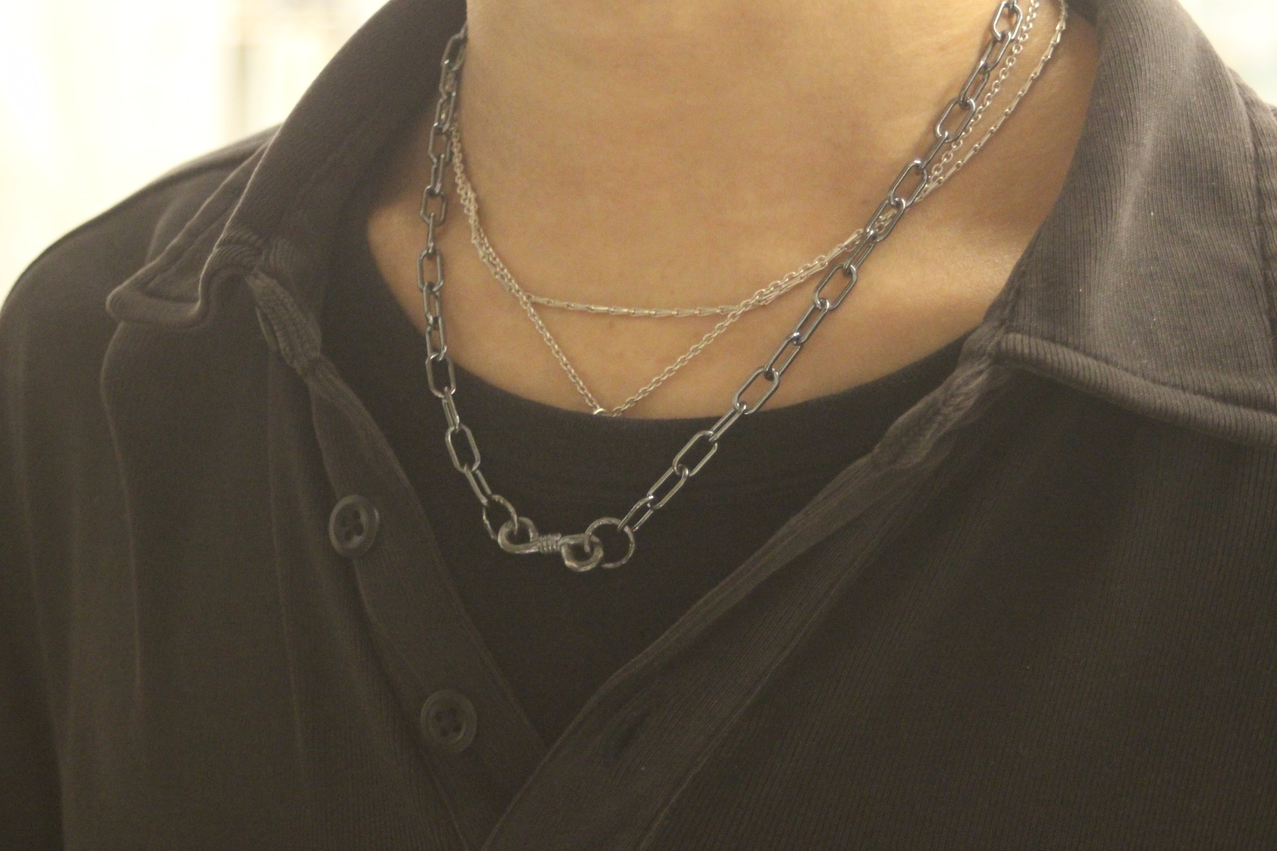 銀の表面に刻まれた傷や燻しは、時とともに表情を変え、身につける人の首元で独自の存在感を放ちます。