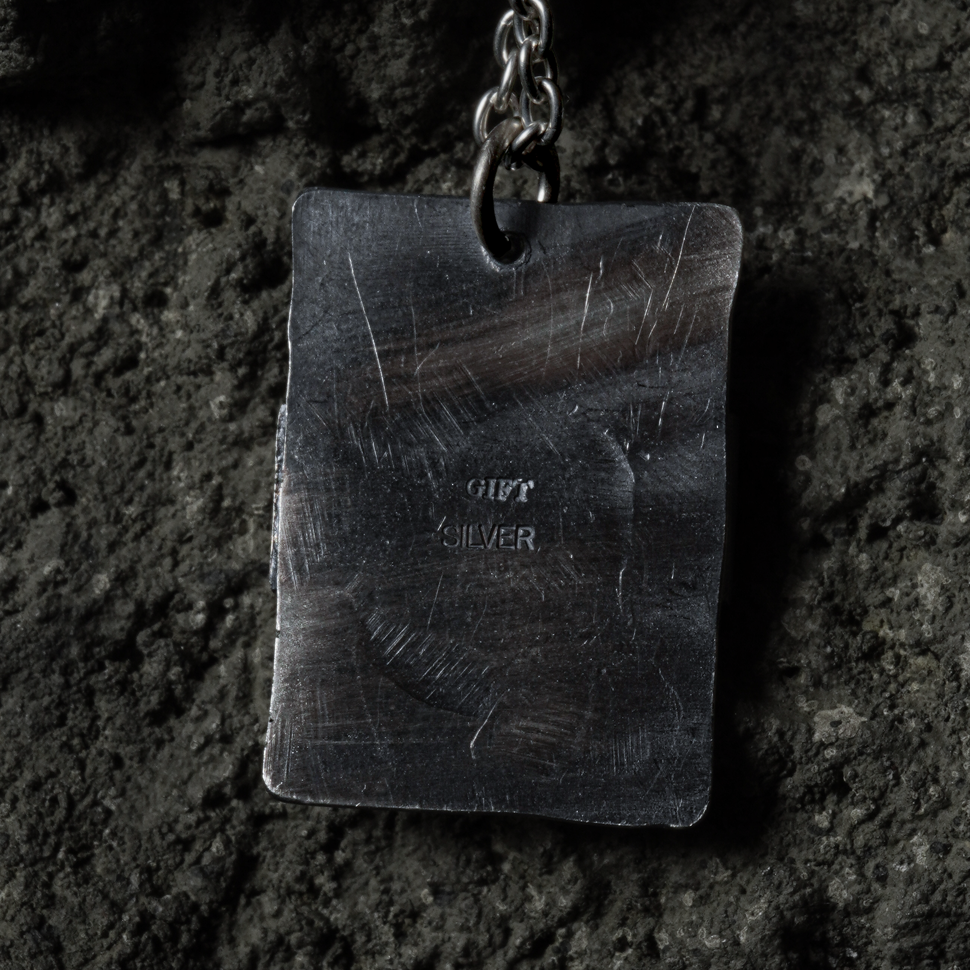 The scratches and smoky marks engraved on the silver surface change appearance over time, creating a unique presence around the wearer's neck.